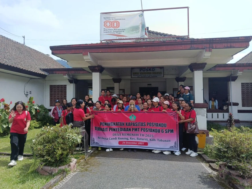 Kegiatan Peningkatan Kapasitas Posyandu terkait Penyediaan PMT Posyandu dalam rangka pemenuhan 6 SPM telah dilaksanakan melalui kunjungan studi ke Desa Candikuning, Kecamatan Baturiti, Kabupaten Tabanan oleh PKK dan Kader Posyandu Desa Kemenuh. Kegiatan ini bertujuan untuk meningkatkan pengetahuan, keterampilan, serta wawasan kader dalam pengelolaan dan penyediaan Pemberian Makanan Tambahan (PMT) yang berkualitas, bergizi, dan berkelanjutan. Melalui kegiatan ini, diharapkan Posyandu di Desa Kemenuh semakin optimal dalam mendukung peningkatan derajat kesehatan ibu dan anak serta mewujudkan pelayanan dasar yang sesuai dengan standar pelayanan minimal.